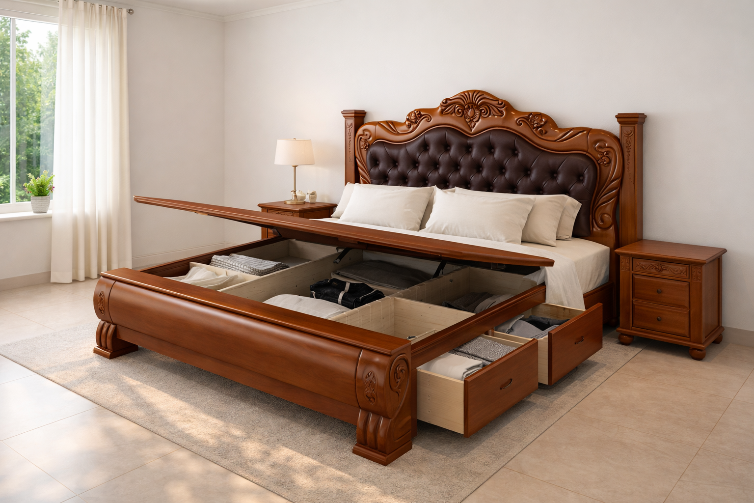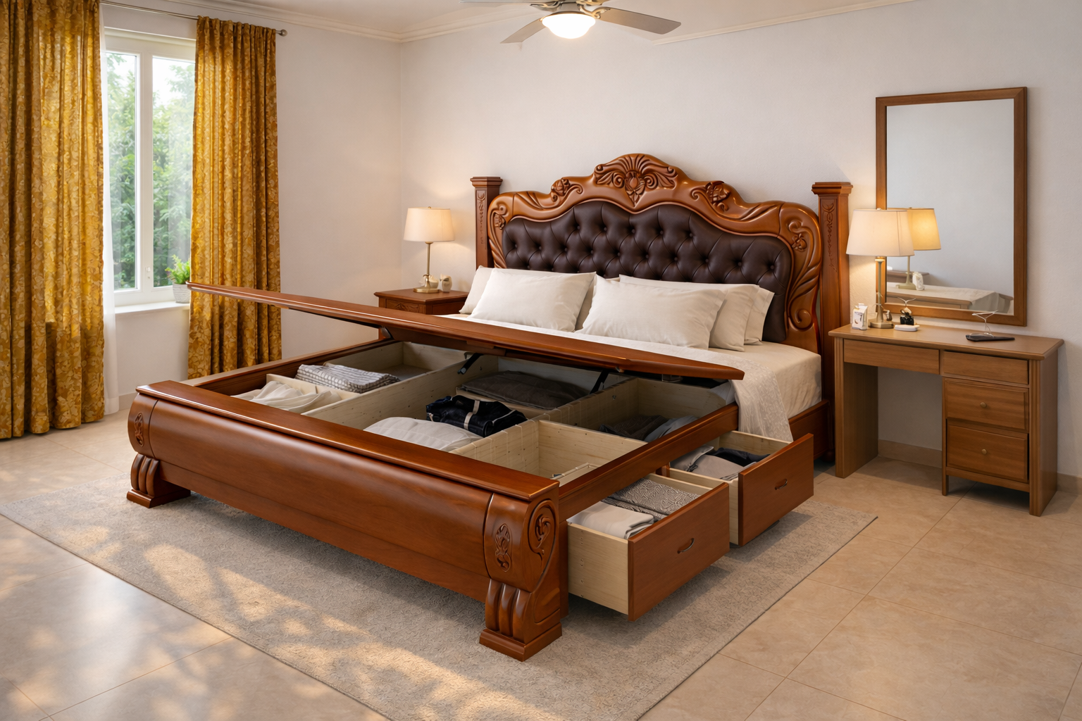 Practical and luxurious cherry walnut carved king bed with hydraulic lift storage and side drawers.