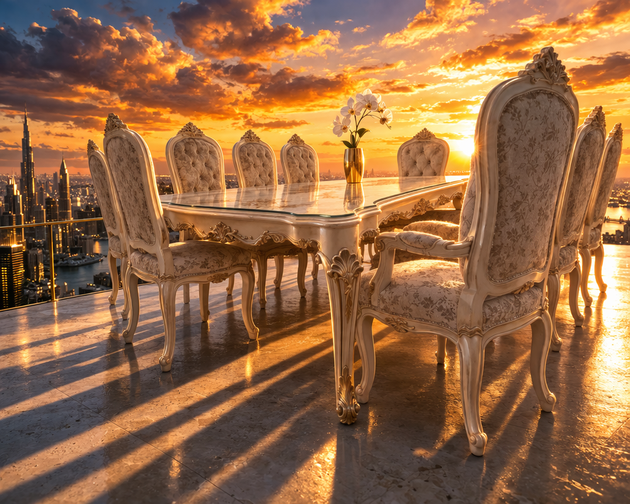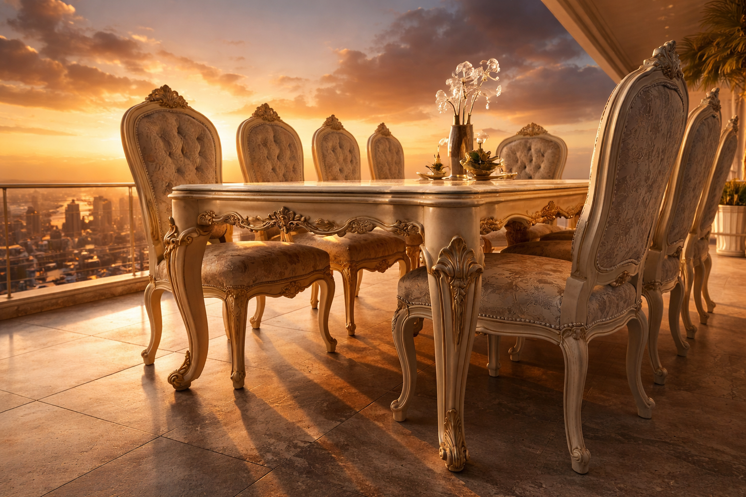 French coastal-style ivory carved dining table with glass top and toile fabric chairs.