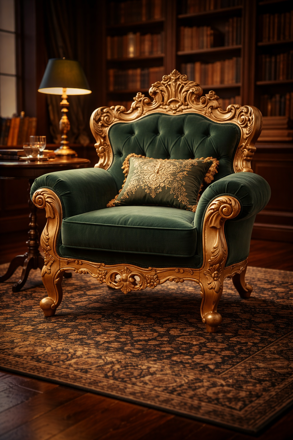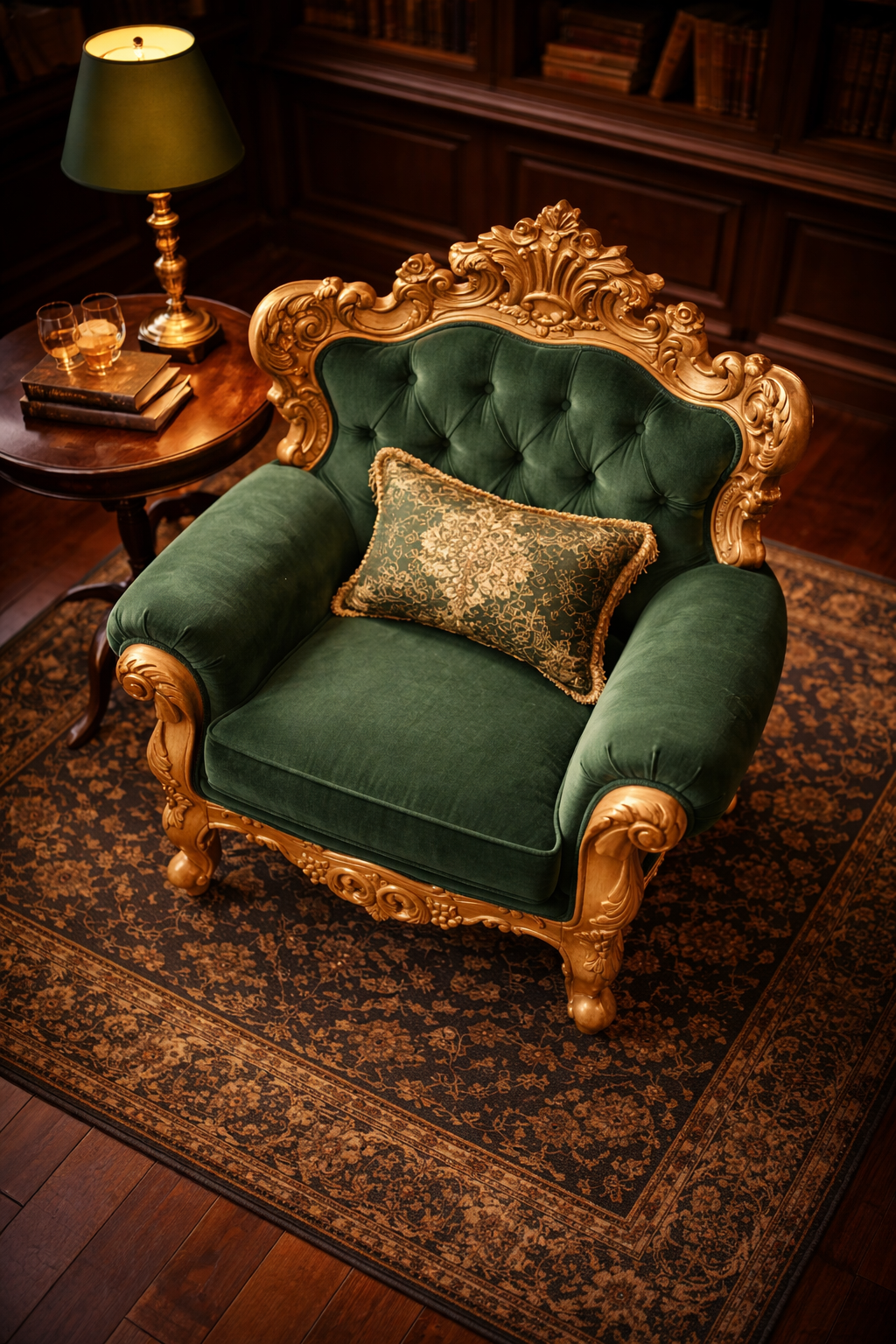 Grand baroque armchair featuring ornate styling, deep-button tufting and exceptional carved detail.