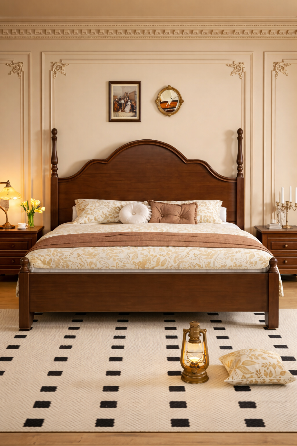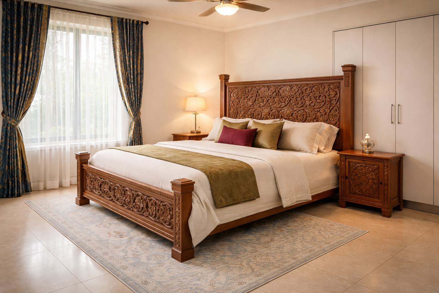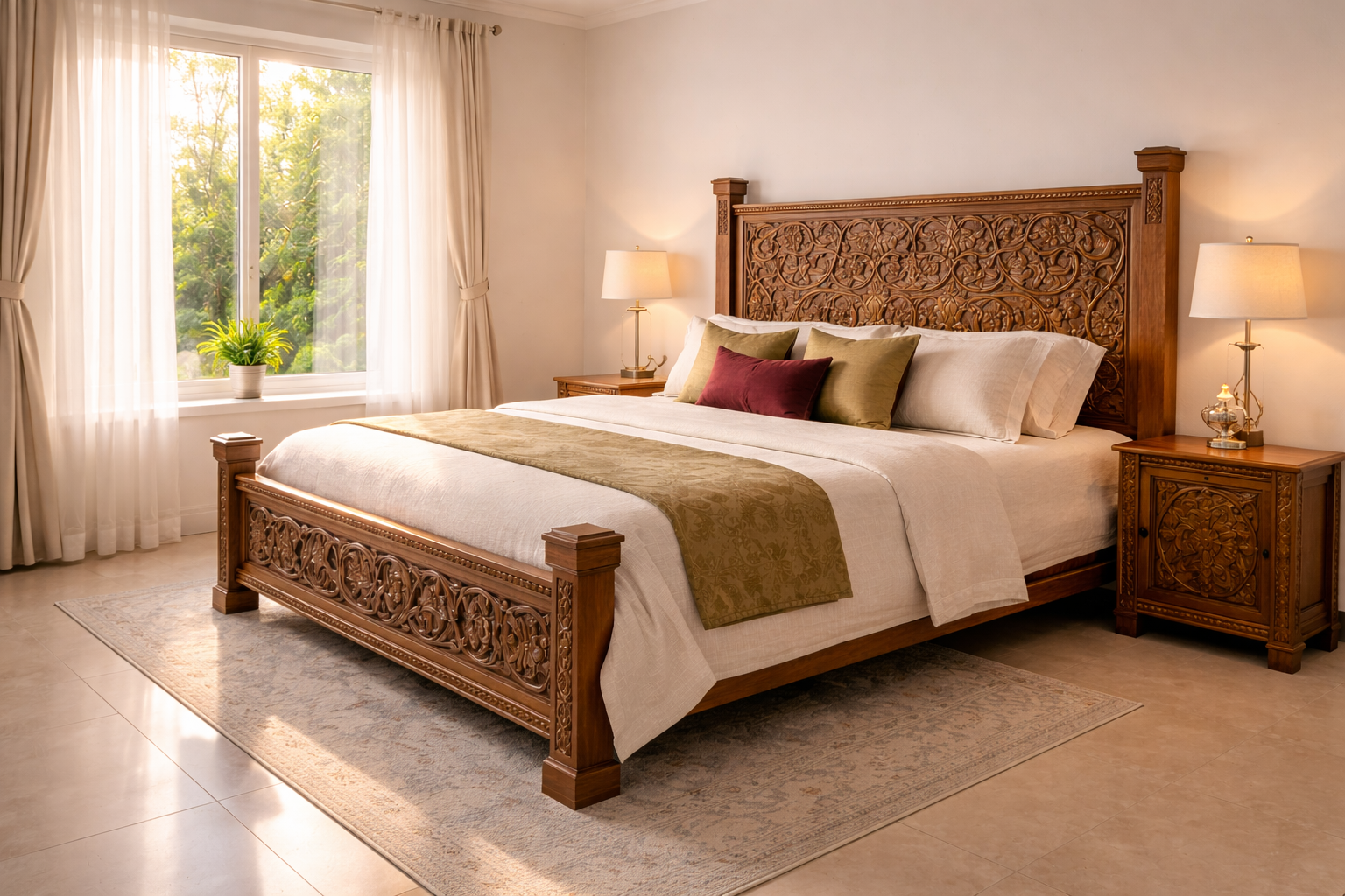 Stunning king bed with deeply carved teak floral panel headboard and footboard.
